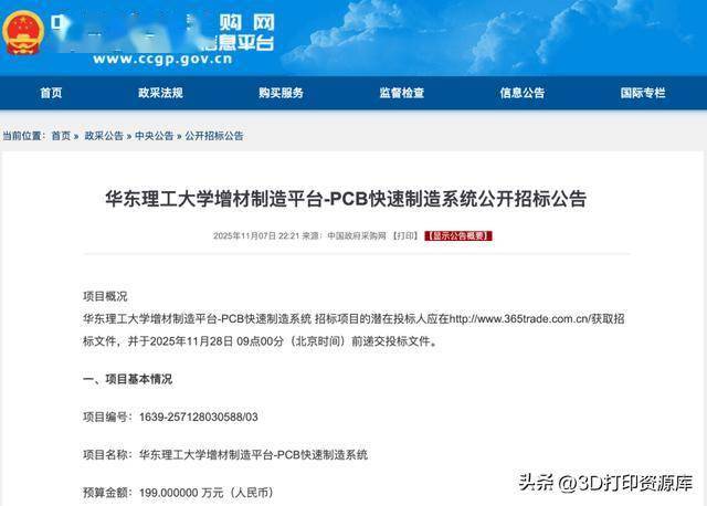华东理工大学就增材制造平台—PCB快速制造系统进行公开招标,总预算199万元。